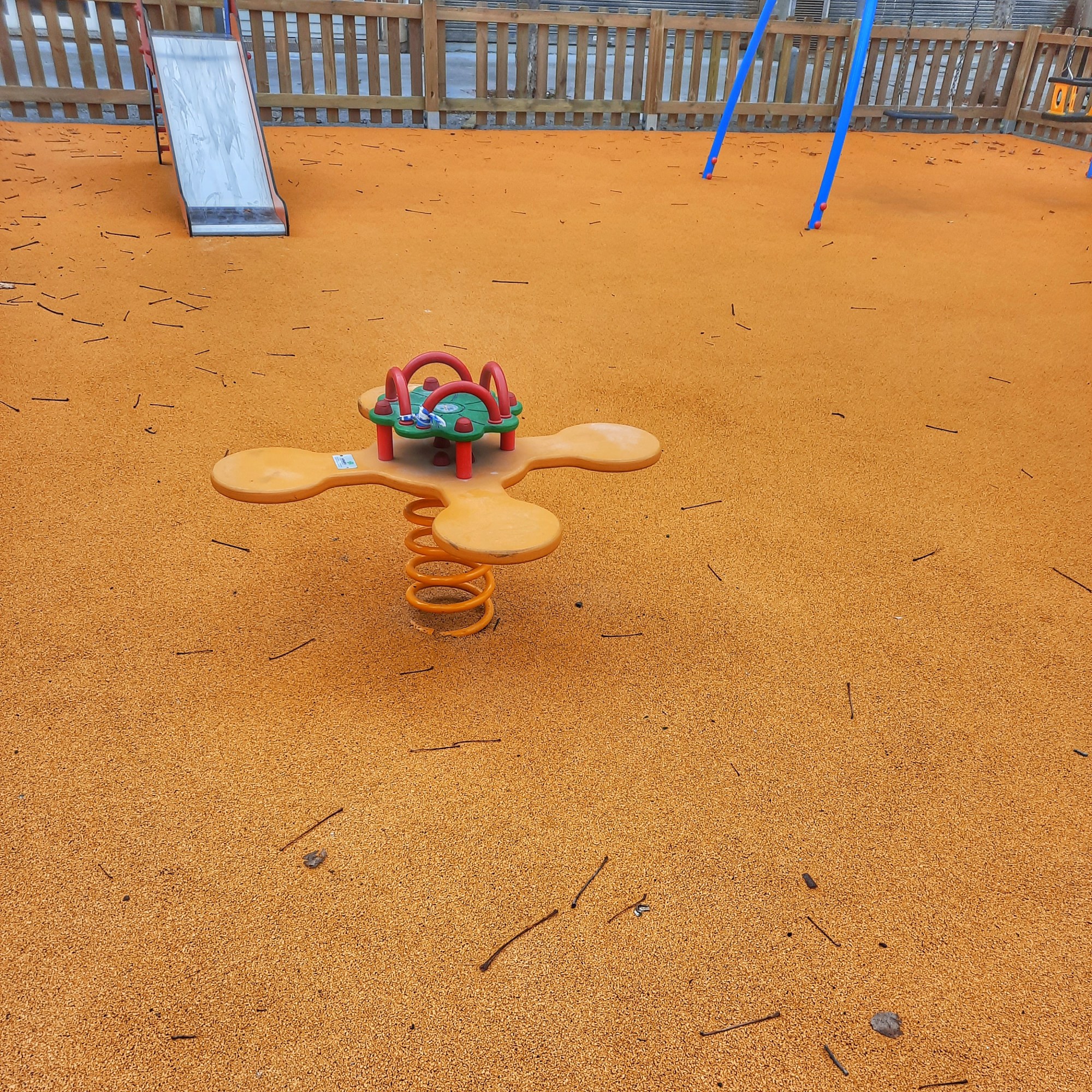 Hay un parque infantil cercado con una valla de madera, con el suelo pintado de amarillo con unos columpios de colores, un pequeño tobogán, una flor y un caballo con un muelle para que los párvulos se distraigan a la hora del recreo. Recuerdo que, antiguamente, el parque infantil estaba abierto, tenía varios columpios de diferentes tipos, un largo tobogán que acababa en un arenero y una especie de rueda donde nos montábamos seis a la vez para girar cada vez más deprisa.